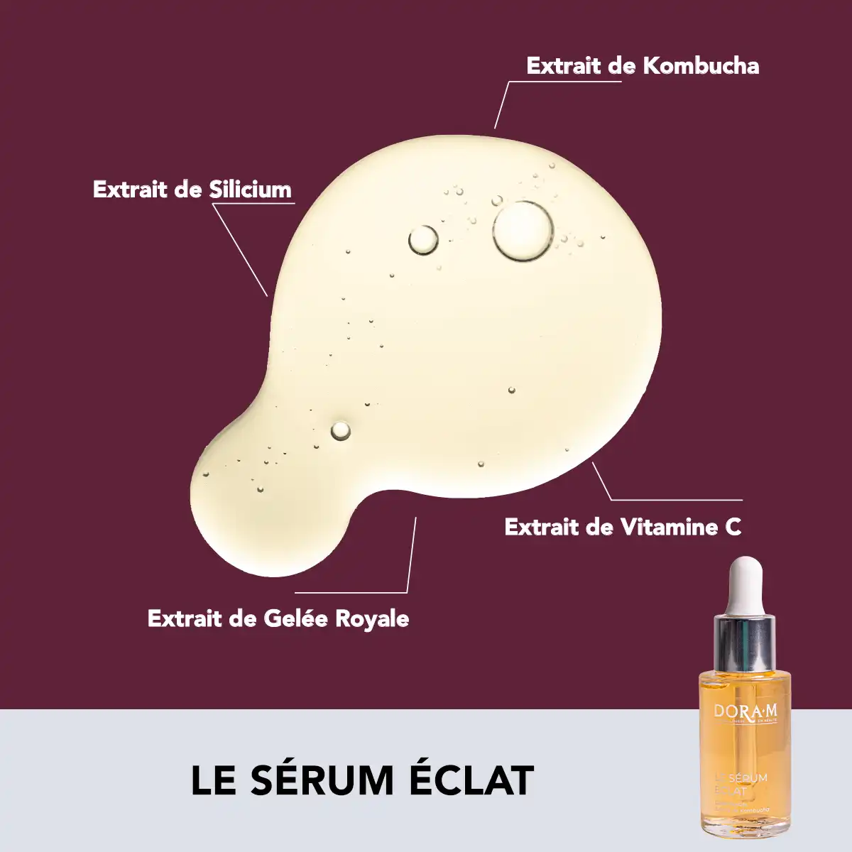 Le Sérum Éclat Antioxydant Dora M est un concentré de vitalité qui agit en profondeur pour raviver l’éclat du teint et protéger la peau du stress oxydatif. Sa formule associe gelée royale, kombucha, vitamine C et silicium pour lisser la peau, améliorer son élasticité et révéler un teint plus lumineux et homogène. En complément, la Crème de Jour à l’Acide Hyaluronique Dora M scelle l’hydratation, protège la peau des agressions extérieures et apporte confort, souplesse et fraîcheur grâce à une synergie d’actifs hydratants et marins.
