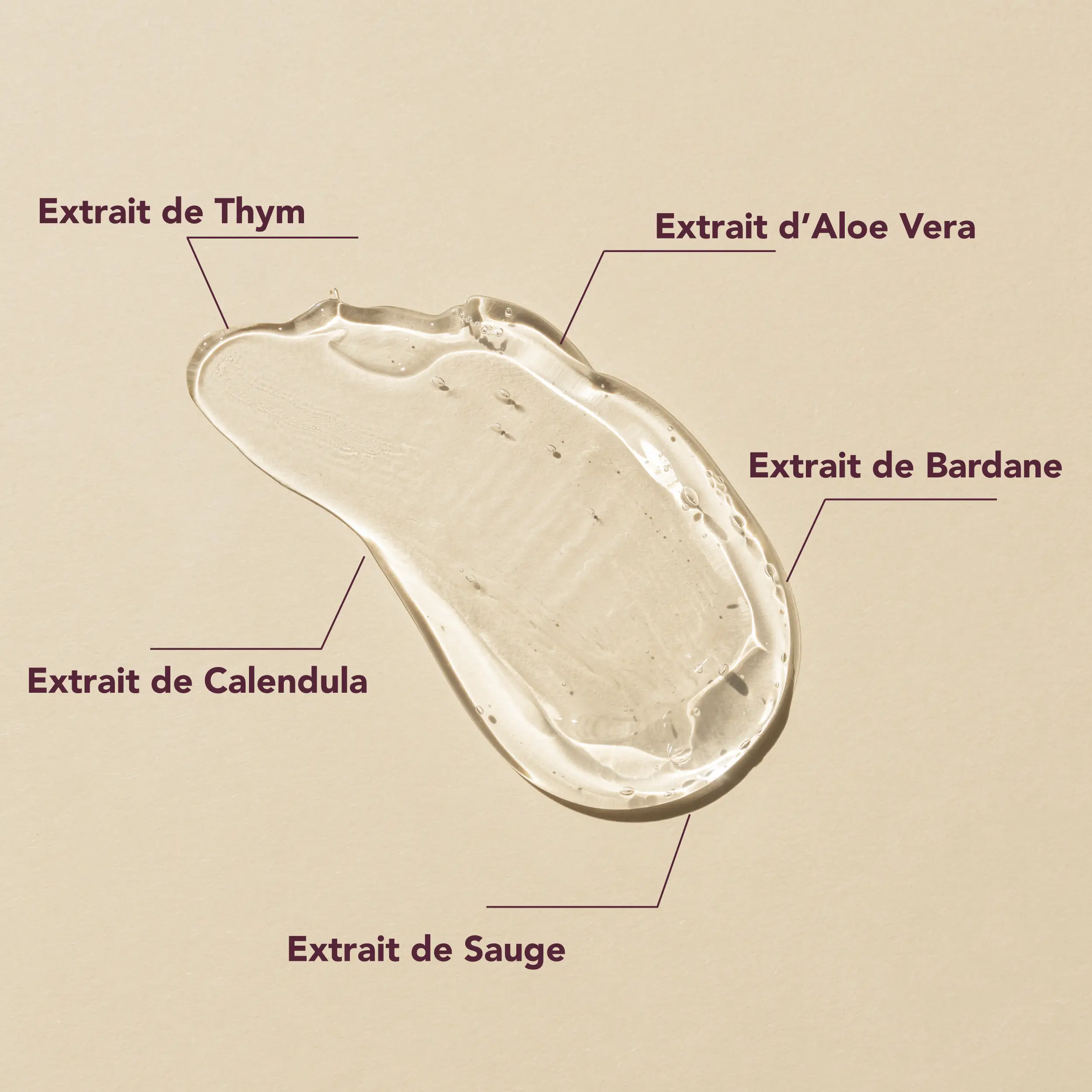 Complexe botanique purifiant : il allie les bienfaits des extraits de plantes aloe vera, calendula, bardane, sauge et thym pour purifier et apaiser la peau. L’aloe vera hydrate, le calendula calme les irritations, tandis que la bardane, la sauge et le thym, aux propriétés purifiantes, aident à réguler la production de sébum, resserrer les pores et prévenir les imperfections.